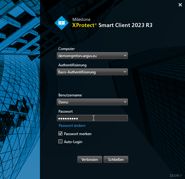 - Bevor Sie beginnen, stellen Sie sicher, dass Sie den neuesten XProtect Smart Client 64 Bit und den Hotfix auf Ihrem Computer installiert haben. Kontaktieren Sie uns, falls Sie noch keinen Account bei Milestone haben und um die Anmeldeinformationen (Benutzername und Passwort) zum Argus Demo Server zu erhalten: support(at)argus.eu