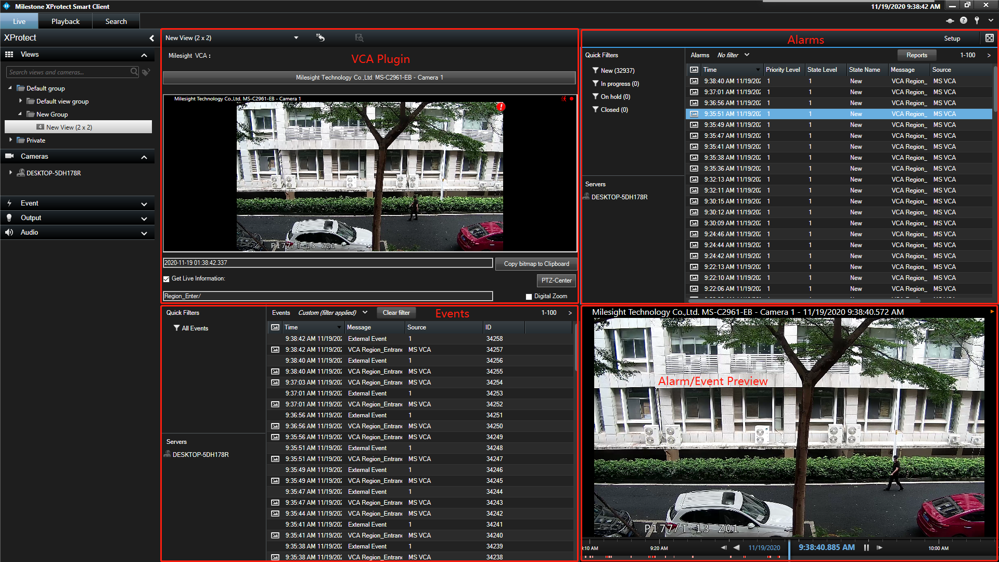 Das Plugin ermöglicht es, Milesight Netzwerkkameras und Milesight VCA vom Management Client aus zu konfigurieren. Im Smart Client können Sie mit dem Plugin die VCA-Alarme in Echtzeit empfangen, die Ereignis- und Alarmdetails anzeigen und nach den ausgelösten VCA-Alarmen und Ereignissen suchen.