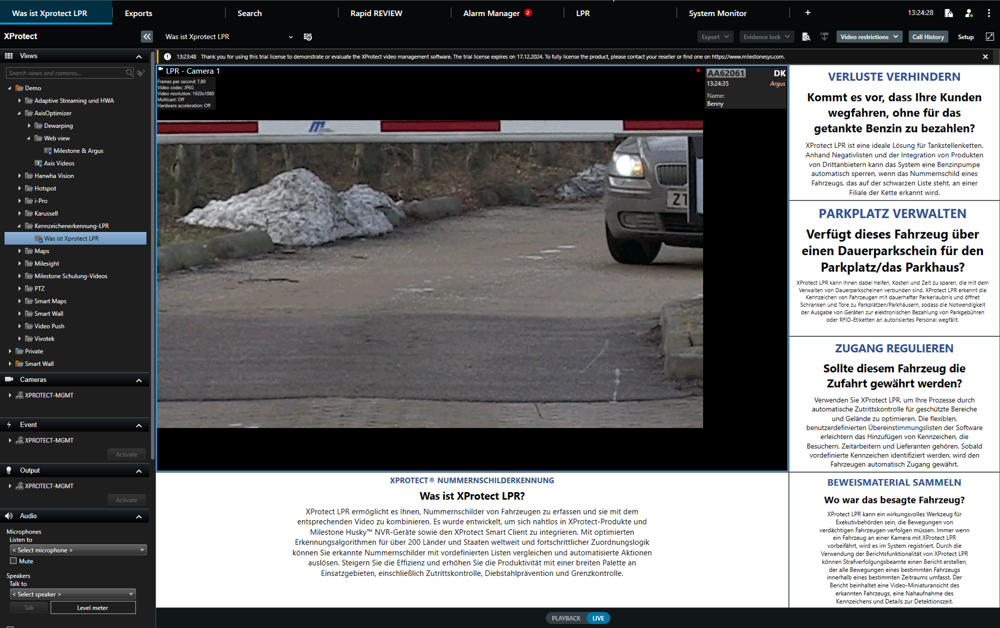 XProtect LPR allows you to capture license plates from vehicles and combine them with the corresponding video. It is designed to integrate seamlessly with XProtect products and Milestone Husky™ NVR devices as well as the XProtect Smart Client. With optimized detection algorithms for over 200 countries and states worldwide and advanced mapping logic, you can compare detected license plates with predefined lists and trigger automated actions. Boost efficiency and increase productivity with a wide range of applications, including access control, theft prevention and border control.